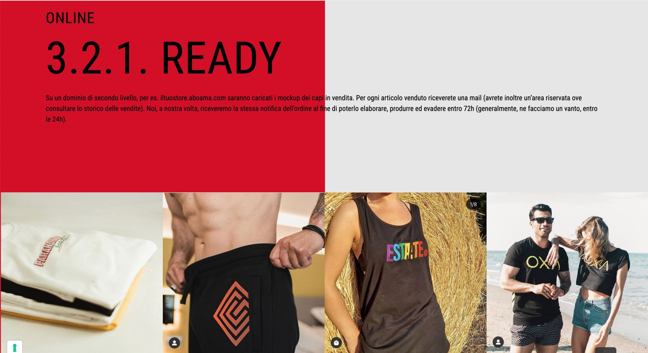 Aboama è un’azienda specializzata in merchandising & abbigliamento che consente ai clienti di avere uno shop personalizzato senza minimo di acquisto e senza magazzino, grazie a tecnologie on-demand.